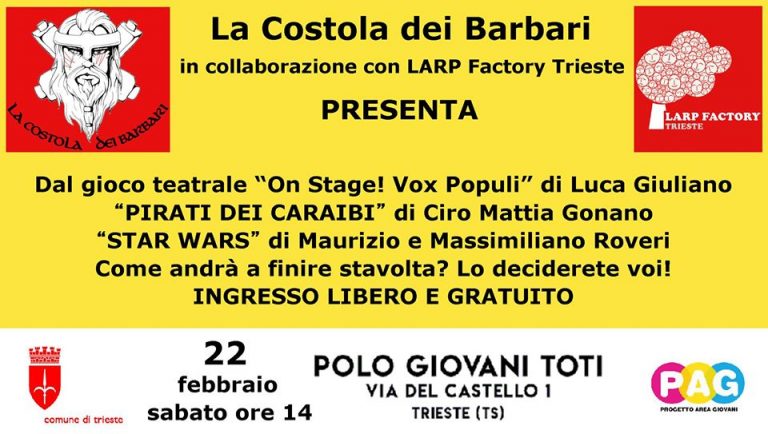 La Costola dei Barbari, associazione di promozione sociale accreditata al P.A.G. – Progetto Area Giovani del Comune di Trieste, in collaborazione con Larp Factory Trieste, sabato 22 febbraio