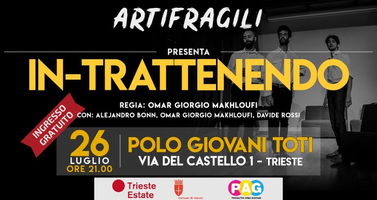 Artifragili, compagnia teatrale professionista accreditata al P.A.G. – Progetto Area Giovani del Comune di Trieste, venerdì 26 luglio alle ore 21.00, al Polo Giovani Toti, con ingresso gratuito