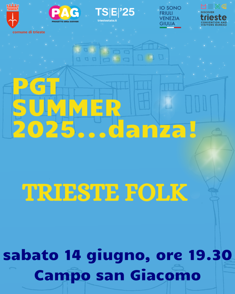 ORE 19.30, CAMPO SAN GIACOMO: TRIESTE FOLK Trieste Folk è un gruppo informale che riunisce tutti gli appassionati di danze balfolknel capoluogo giuliano. Accreditato al Progetto Area Giovani,