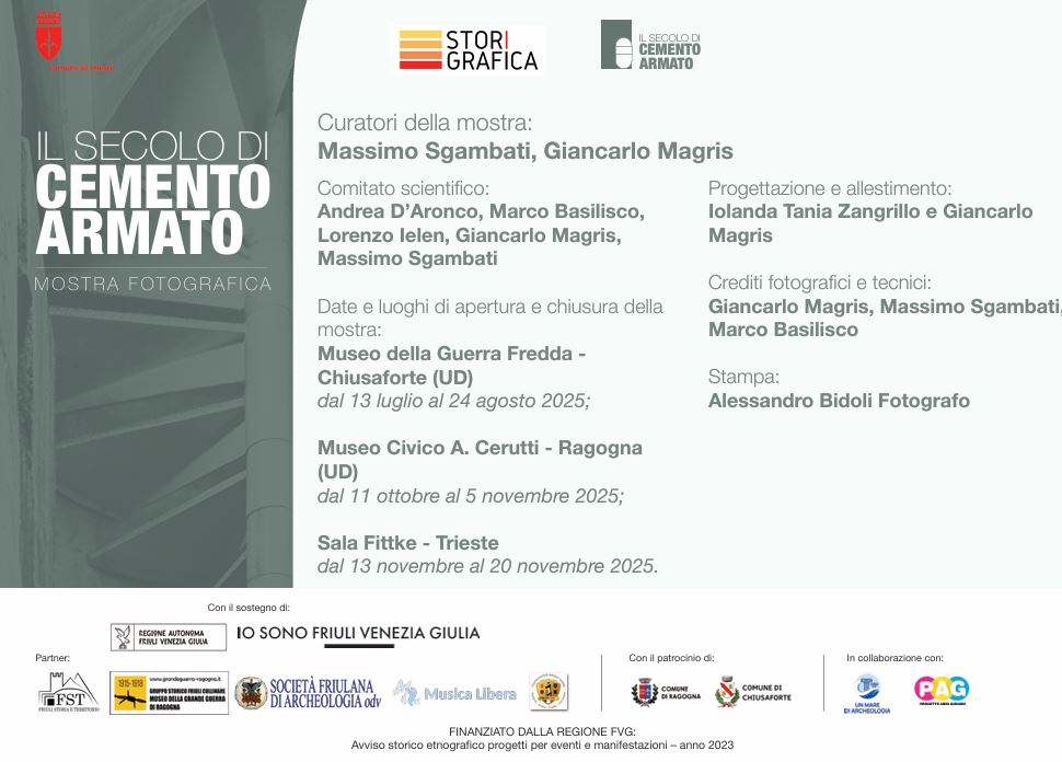 Inaugurazione venerdì 14 novembre ore 18.00Dopo Chiusaforte e Ragogna, la mostra fotografica “Il secolo di Cemento Armato” promossa da Storigrafica APS approda a Trieste. Sarà visitabile presso la Sala Fittke di Piazza Piccola, 3 dal 15 al 20 novembre 2025 con ingresso libero. L’inaugurazione è prevista per venerdì 14 novembre alle ore 18.00Il progetto, promosso da Storigrafica APS con il contributo della Regione Autonoma Friuli Venezia Giulia, nasce da un’ampia documentazione fotografica e storica e si propone di raccontare il ruolo del cemento armato come elemento che, oltre a definire il paesaggio, diventa testimonianza materiale di eventi, memorie e trasformazioni di un secolo segnato da guerre e conflitti.La mostra “Il secolo di Cemento Armato” è realizzata con la collaborazione di FST – Friuli Storia Territorio, della Società Friulana di Archeologia ODV, della Federazione Grigioverde, del Museo della Grande Guerra di Ragogna e dell’Associazione Musica Libera.