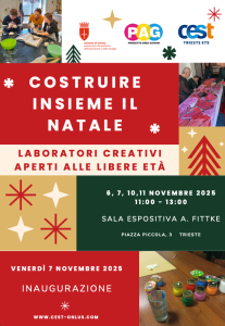 "COSTRUIRE INSIEME IL NATALE" Mostra promossa dall'Associazione CEST durante la quale Il gruppo dei giovani e dei volontari esporranno le loro proposte per il Natale. Durante i giorni di esposizione, inoltre, verranno proposti dei laboratori attraverso i quali i frequentatori della mostra potranno cimentarsi nella costruzione di oggetti e messaggi di auguri sotto la guida attenta dei giovani e dei volontari, che diverranno a loro volta insegnanti.