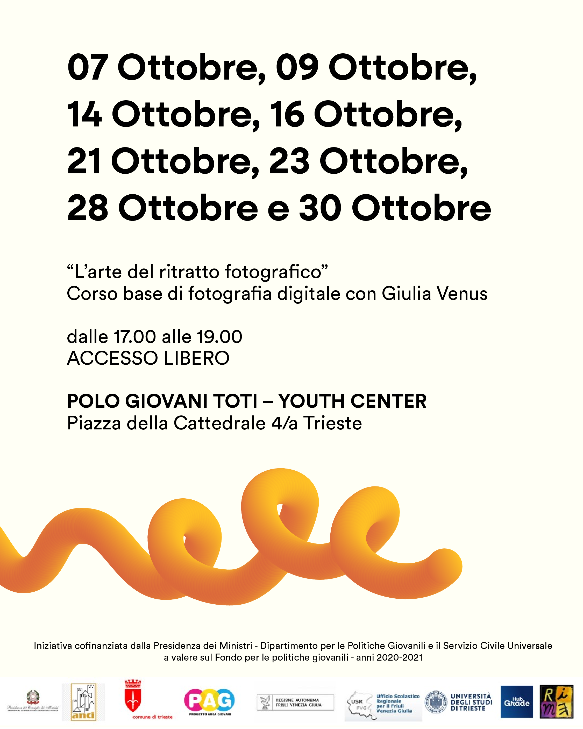 Dal 7 al 28 Ottobre ogni Lunedì e Mercoledì dalle 17:00 alle 19:00 e Venerdì 25 dalle 10:00 alle 12:00, al Polo Giovani Toti – Youth Center di Trieste, non perdere l’opportunità di immergerti nel mondo della fotografia!